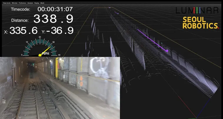 Luminar utilizes long-range LiDAR technology coupled with perception software from their partner, Seoul Robotics, to accurately position a train underground, including areas where GPS traditionally fails. The product provides accurate arrival and departure data and can be further trained to detect hazards and structural damage on the tracks.
